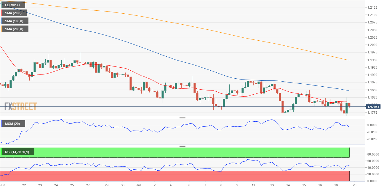 El par EUR/USD mantiene la postura bajista a pesar de rebotar desde su mínimo intradiario. El extremo superior de un canal descendente diario contiene el alza en torno a 1.1840. El gráfico de 4 horas muestra que una media móvil simple de 20 plana limitó el alza, mientras que las más largas siguen dirigiéndose hacia el sur muy por encima de ella, sesgando el riesgo a la baja. El indicador Momentum se recuperó en niveles negativos, pero el indicador RSI se consolida alrededor de 44, todos los cuales favorecen otro tramo hacia el sur.