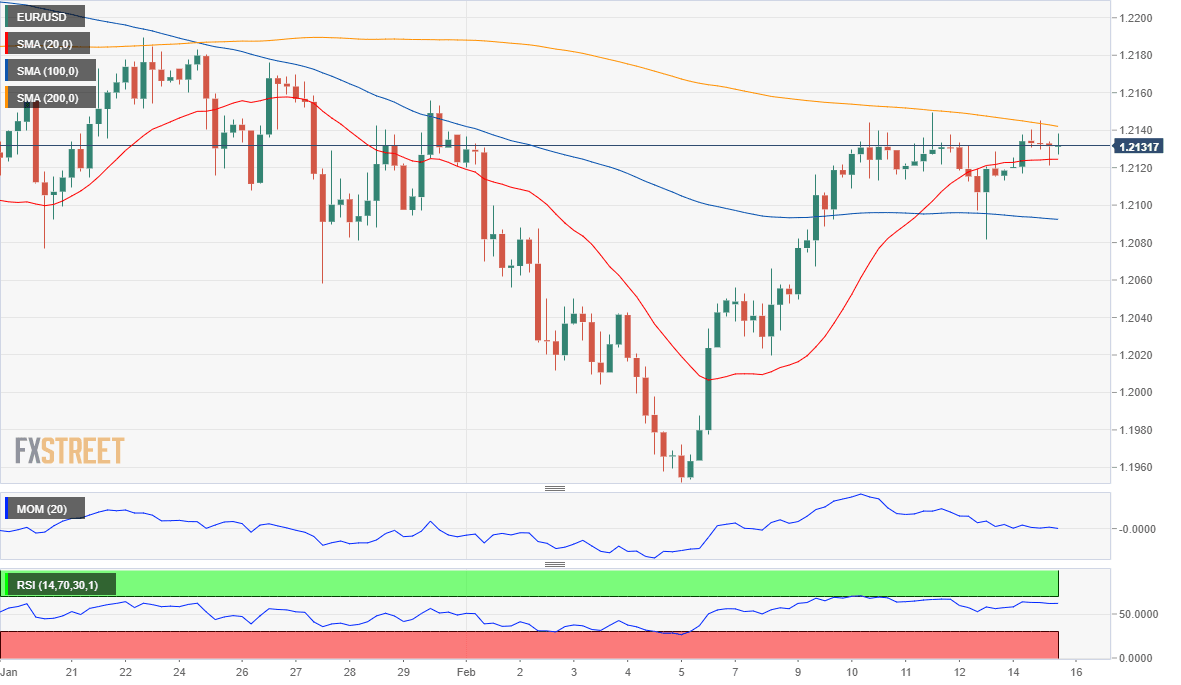 El par EUR/USD se mantiene sin cambios por cuarto día consecutivo alrededor de 1.2130, neutral en el corto plazo. En el gráfico de 4 horas, el par permanece atrapado entre sus SMA de 100 y 200, que carecen de fuerza direccional, mientras que los indicadores técnicos siguen rondando sus líneas medias. Mientras tanto, el par se mantiene por debajo del retroceso del 23.6% de su rally de noviembre/enero en la zona de precios de 1.2170, el área a superar para ganar tracción alcista.