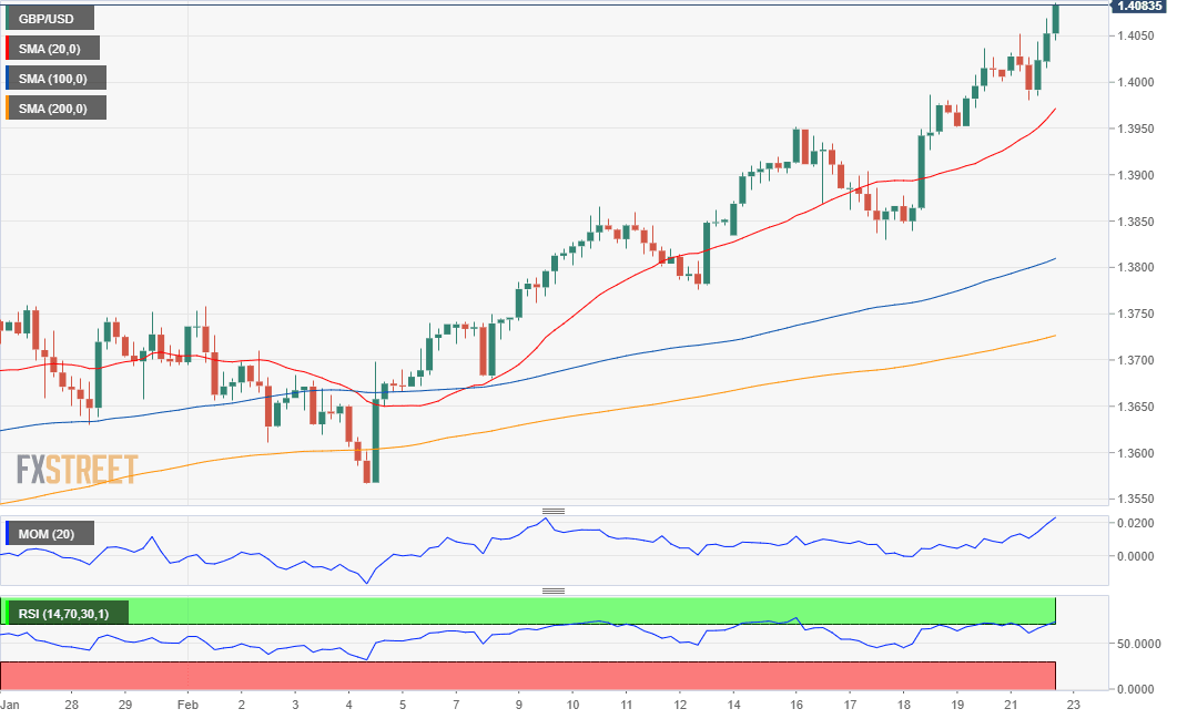 El par GBP/USD cotiza en la zona de precios de 1.4070 y podría continuar subiendo en las próximas sesiones. En el gráfico de 4 horas, la SMA de 20 acelera hacia el norte muy por debajo del nivel actual y muy por encima de las más largas, que también suben. El indicador Momentum baja desde los niveles de sobrecompra, pero el par se mantiene cerca de sus máximos diarios. El indicador RSI, mientras tanto, se ha estabilizado por encima de 70, sin signos de agotamiento al alza.