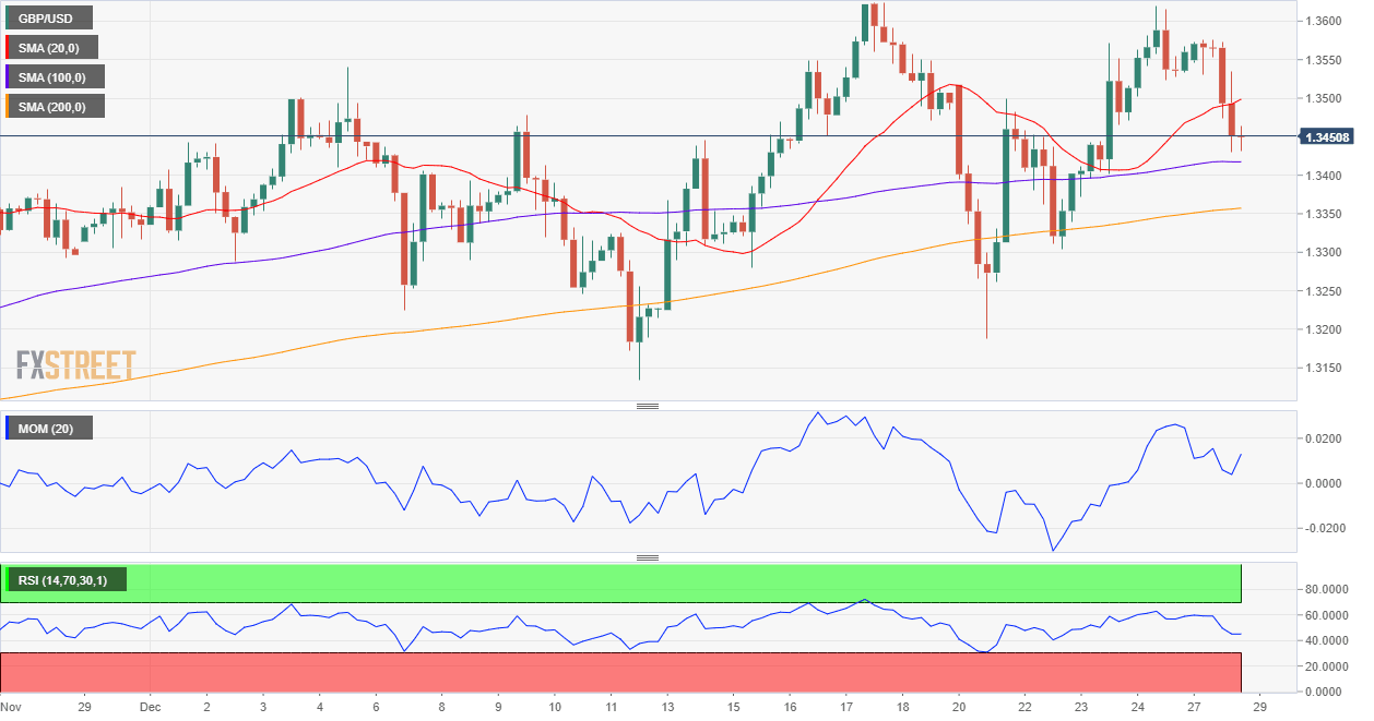 El par GBP/USD cotiza cerca de un mínimo diario en 1.3428 y corre el riesgo de extender su caída. En el gráfico de 4 horas, el par ha caído por debajo de una media móvil simple de 20 ahora plana, rebotando, sin embargo, desde alrededor de una media móvil simple de 100 ligeramente alcista. El indicador Momentum se dirige firmemente hacia abajo, cruzando su línea media hacia territorio negativo, ya que el RSI se consolida alrededor de 46. El par podría extender su caída una vez por debajo de 1.3420, donde la mencionada SMA de 100 proporciona soporte dinámico.