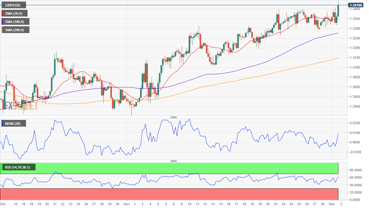 El par GBP/USD mantiene la mayoría de sus ganancias intradiarias, operando en la zona de precios de 1.3420. El par es alcista en el corto plazo, ya que el gráfico de 4 horas muestra que se está desarrollando cómodamente por encima de todos sus promedios móviles. Las más largas aceleraron hacia el norte por debajo de la media simple de 20, que lentamente gana tracción alcista. Los indicadores técnicos se han acercado a la lectura de sobrecompra, perdiendo impulso alcista a medida que el día llega a su fin. El máximo de septiembre en 1.3481 es el nivel a romper para confirmar otro tramo hacia el norte este miércoles.