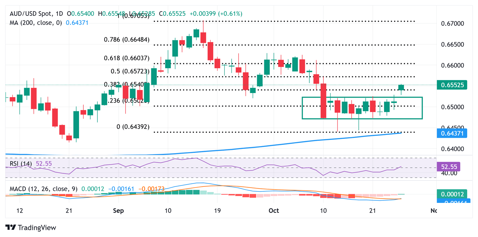 El par AUD/USD abre con un hueco alcista al inicio de una nueva semana y confirma una ruptura a través de un rango de negociación de casi dos semanas en reacción a señales alentadoras de progreso en las discusiones comerciales entre EE.UU. y China. De hecho, altos funcionarios de EE.UU. y China acordaron el domingo un marco para un posible acuerdo comercial que se discutirá cuando el presidente de EE.UU., Donald Trump, y el presidente chino, Xi Jinping, se reúnan más adelante esta semana. Además, el secretario del Tesoro de EE.UU., Scott Bessent, dijo que la discusión en los márgenes de la Cumbre de la ASEAN en Kuala Lumpur eliminó la amenaza de aranceles del 100% sobre las importaciones chinas a partir del 1 de noviembre. Esto calma los nervios de los inversores y alivia las preocupaciones sobre una guerra comercial total entre las dos economías más grandes del mundo, lo que, a su vez, impulsa al Dólar australiano (AUD), que actúa como proxy de China.