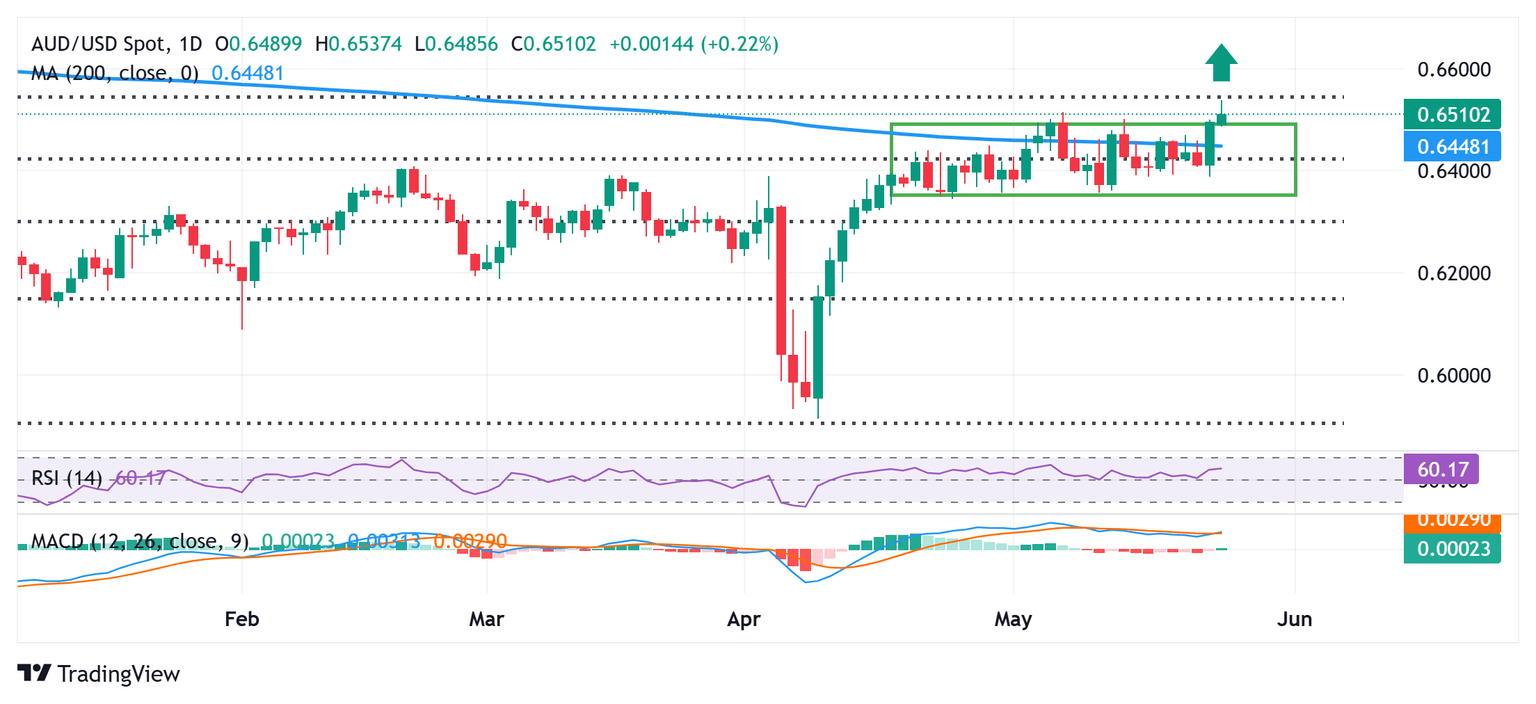 Mientras tanto, la decisión de Trump de retrasar la implementación de un arancel del 50% a la Unión Europea desde el 1 de junio hasta el 9 de julio aumenta la confianza de los inversores. Esto es evidente en un tono generalmente positivo en torno a los mercados de acciones, que se considera otro factor que socava al Dólar de refugio seguro y beneficia al Aussie, percibido como más arriesgado. Dicho esto, las tensiones comerciales entre EE.UU. y China y los persistentes riesgos geopolíticos podrían mantener un límite sobre el optimismo del mercado y el Dólar australiano (AUD).