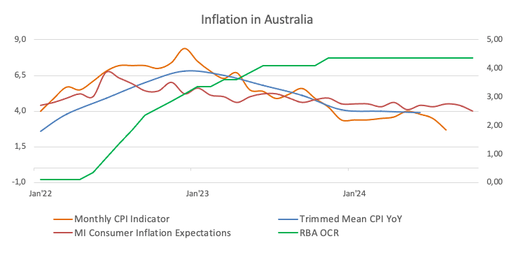 El sentimiento del mercado actualmente refleja una probabilidad del 55% de un recorte de tasas de 25 puntos básicos para fin de año, con el RBA esperado como uno de los últimos bancos centrales del G10 en recortar tasas, probablemente en respuesta a la desaceleración del crecimiento económico y la disminución de las presiones inflacionarias.