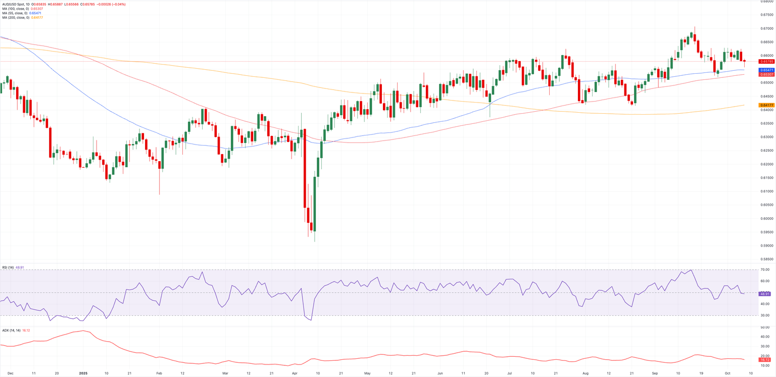 El apetito especulativo por el Dólar australiano sigue siendo limitado. Con los nuevos datos de la Comisión de Comercio de Futuros de Productos Básicos (CFTC) retrasados por el cierre del gobierno de EE.UU., las últimas cifras disponibles hasta el 23 de septiembre mostraron que las posiciones cortas netas aumentaron a máximos de dos semanas alrededor de 101.6K contratos, mientras que el interés abierto subió a 160.8K contratos.