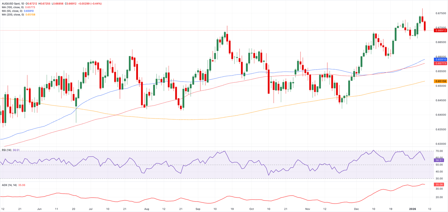 El Dólar australiano (AUD) se encuentra bajo presión renovada el jueves, con el AUD/USD retrocediendo desde nuevos máximos de 15 meses cerca de 0.6760 para revisitar el área de 0.6680 en un movimiento que dejó atrás una racha ganadora de tres días, aunque el spot aún mantiene un sólido inicio de año en general.