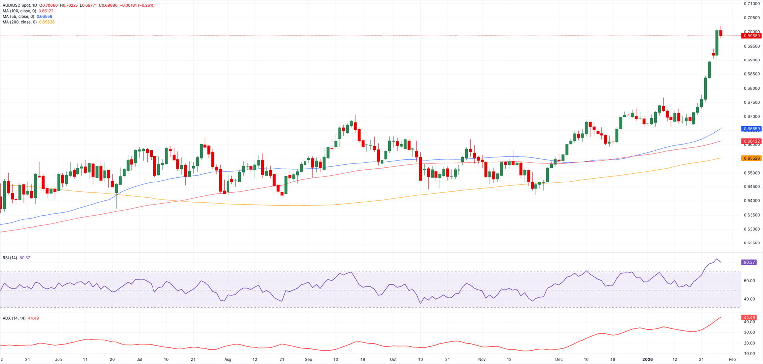El AUD/USD finalmente ha probado la clave barrera de 0.7000, aunque ha estado bajo cierta presión a la baja desde entonces. La actual condición de sobrecompra sigue reforzando el caso para una "corrección técnica" a corto plazo.