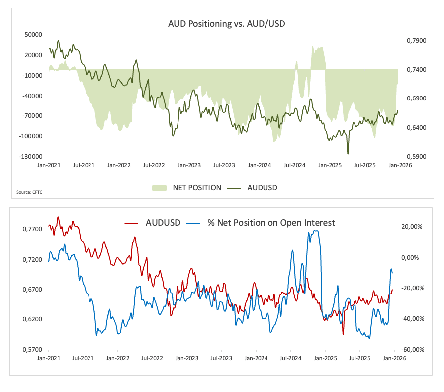 Los datos de la CFTC para la semana que terminó el 23 de diciembre mostraron que los especuladores continúan reduciendo la exposición bajista al AUD, con posiciones cortas netas cayendo a casi 26K contratos, el nivel más bajo desde finales de septiembre de 2024.