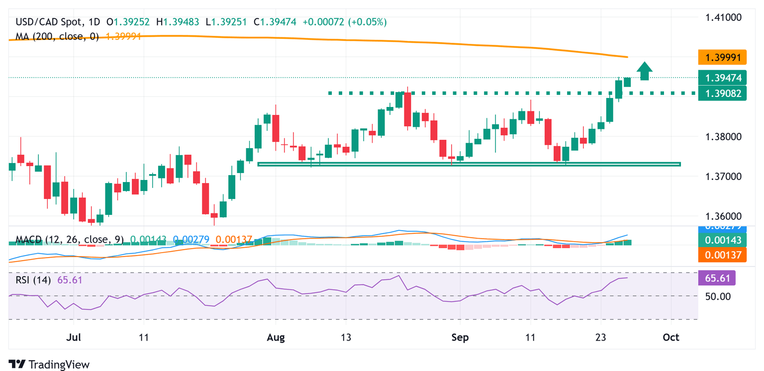 Los datos sólidos apuntan a una resiliencia económica a pesar de los vientos en contra derivados de los aranceles comerciales del presidente de EE.UU., Donald Trump, y templar las esperanzas de un alivio más agresivo de la política por parte de la Fed. No obstante, los operadores aún están valorando una mayor probabilidad de que el banco central de EE.UU. reduzca los costos de endeudamiento nuevamente en octubre y diciembre. Esto, a su vez, provoca cierta recogida de beneficios en torno al USD antes de la publicación del Índice de Precios de Consumo Personal (PCE) de EE.UU. más tarde durante la sesión norteamericana. Aparte de esto, la publicación del PIB mensual canadiense para julio, que se espera que muestre que la economía creció un 0.1%, podría proporcionar algún impulso al par USD/CAD de cara al fin de semana.