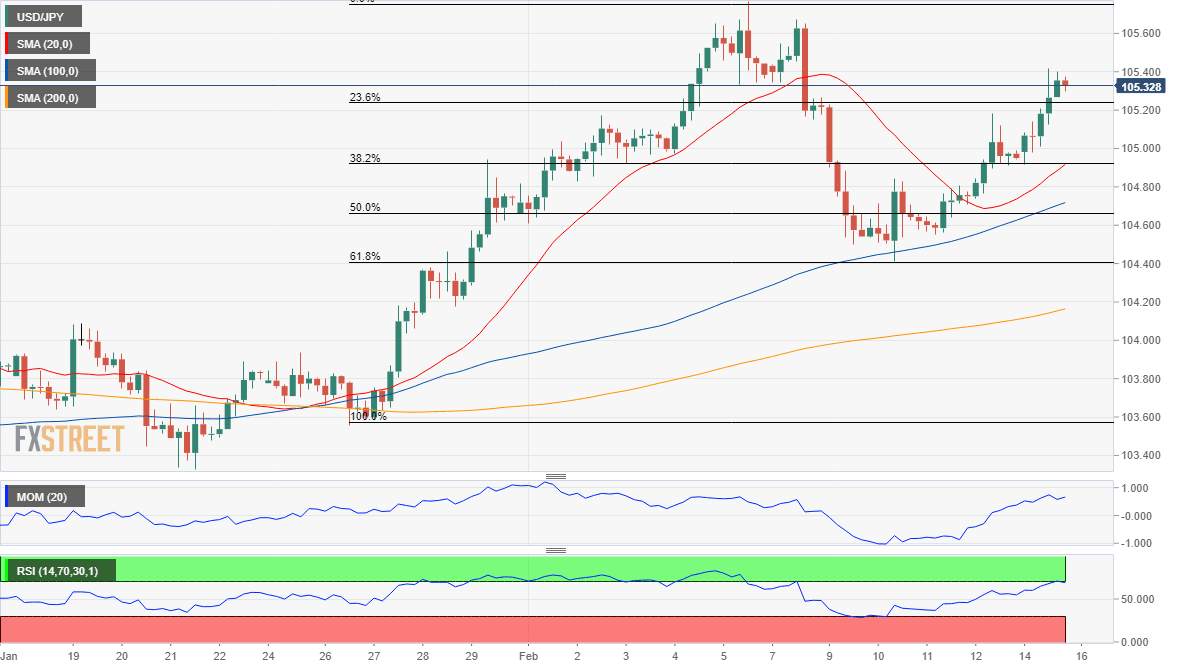 El par USD/JPY cotiza alrededor de 105.30, justo por encima del retroceso del 23.6% de su último avance diario, que expone este máximo de enero en 105.76. En el gráfico de 4 horas, los indicadores técnicos se han retirado desde los máximos intradiarios, pero permanecen muy por encima de sus líneas medias, ya que el par se desarrolla por encima de las medias móviles alcistas. El par tiene espacio para volver a probar el máximo de este mes en 106.76 e incluso superarlo, si persiste el optimismo del mercado actual.
