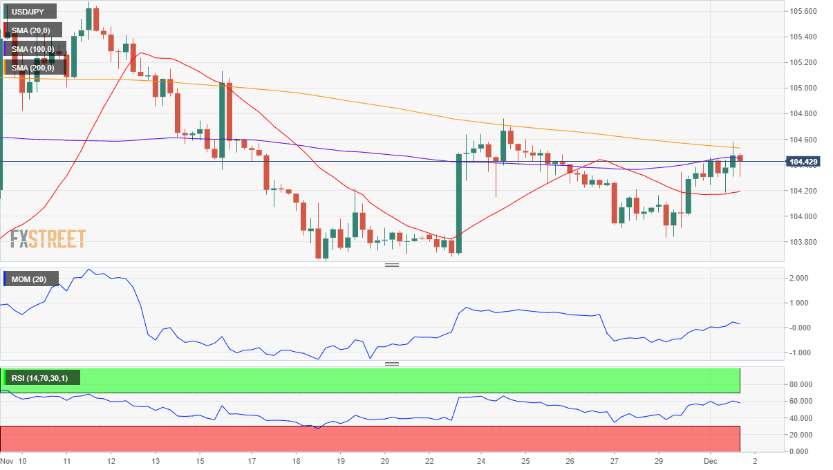 El par USD/JPY mantiene una postura neutral en el corto plazo y de acuerdo con el gráfico de 4 horas. En el marco de tiempo mencionado, el par está atrapado dentro de las medias móviles, con una media móvil simple de 200 ligeramente bajista que proporciona una resistencia alrededor de 104.55. Los indicadores técnicos permanecen sin dirección justo por encima de sus líneas medias, lo que refleja la ausencia de interés especulativo.