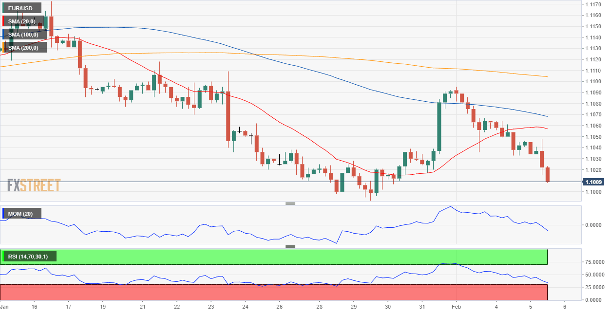 El par EUR/USD cotiza a mínimos diarios cerca del nivel de 1.1000 antes de la apertura de Wall Street, claramente bajista en el corto plazo. El gráfico de 4 horas muestra que ha extendido su caída por debajo de todas sus medias móviles, en línea con el fuerte interés de venta. Mientras tanto, los indicadores técnicos se dirigen firmemente hacia el sur, llegando a niveles de sobreventa. El par ha tocado fondo en enero en 1.0991, aunque un soporte más fuerte se encuentra en 1.0980, un mínimo relevante de noviembre pasado. El impulso bajista probablemente aumentará en un quiebre por debajo de este último.