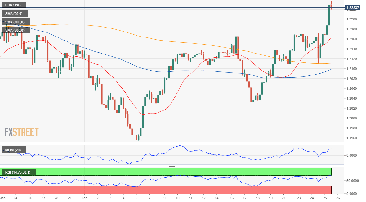 El par EUR/USD cotiza por encima de 1.2200 por primera vez desde principios de enero, dado que se encendió el sentimiento relacionado con el riesgo. El dólar ha bajado, las bolsas mundiales han subido y los rendimientos de la deuda pública estadounidense alcanzan nuevos máximos de un año. La divisa compartida se despertó después de haber quedado rezagada durante un par de semanas, manteniendo su impulso alcista a pesar de que otros rivales del dólar retrocedieron desde máximos diarios.