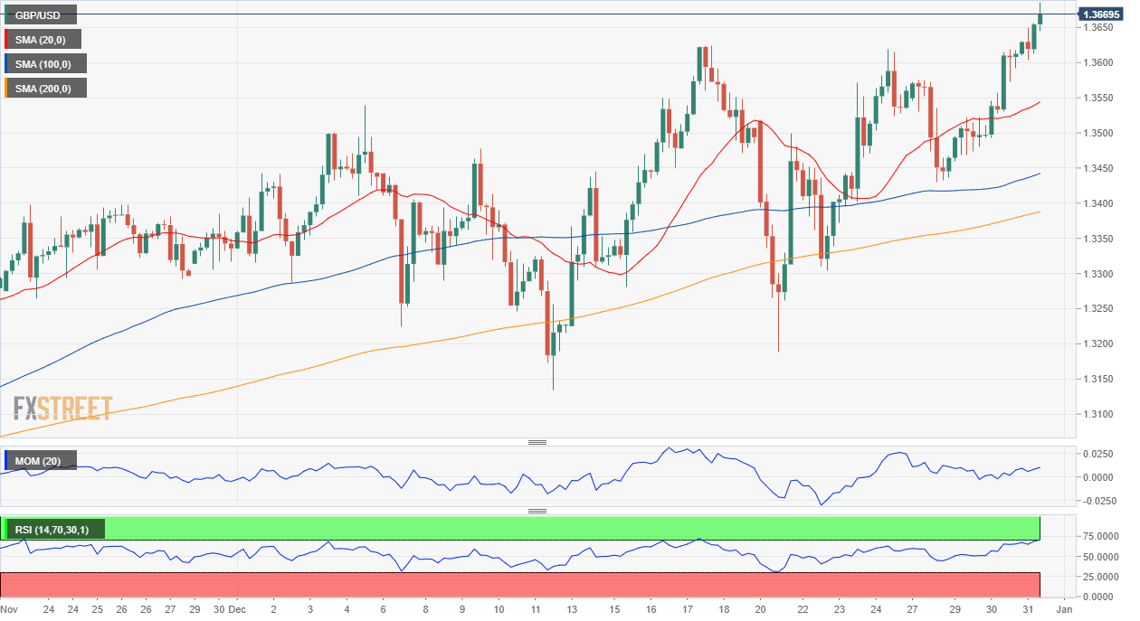 El par GBP/USD está presionando máximos diarios y acercándose a la cifra de 1.3700, sin signos de agotamiento alcista. La debilidad del dólar en general añade al caso alcista del par. A corto plazo, y según el gráfico de 4 horas, el riesgo sigue sesgado al alza, a pesar de las lecturas de sobrecompra. El par ha seguido avanzando por encima de medias móviles alcistas, mientras que los indicadores técnicos siguen subiendo. Se espera otro tramo hacia el norte en una ruptura por encima de 1.3710, el nivel de resistencia inmediato.