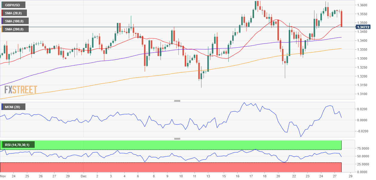 El par GBP/USD cotiza en mínimos diarios en la zona de precios de 1.3470, y el panorama técnico a corto plazo sugiere que la caída puede extenderse durante las próximas horas. En el gráfico de 4 horas, el par está perforando su SMA de 20, que perdió su impulso alcista, aunque todavía por encima de las más largas. Los indicadores técnicos se han vuelto drásticamente a la baja, con el RSI ya en niveles negativos. Parece probable que se produzcan más caídas en una ruptura por debajo de 1.3470, el nivel de soporte inmediato.