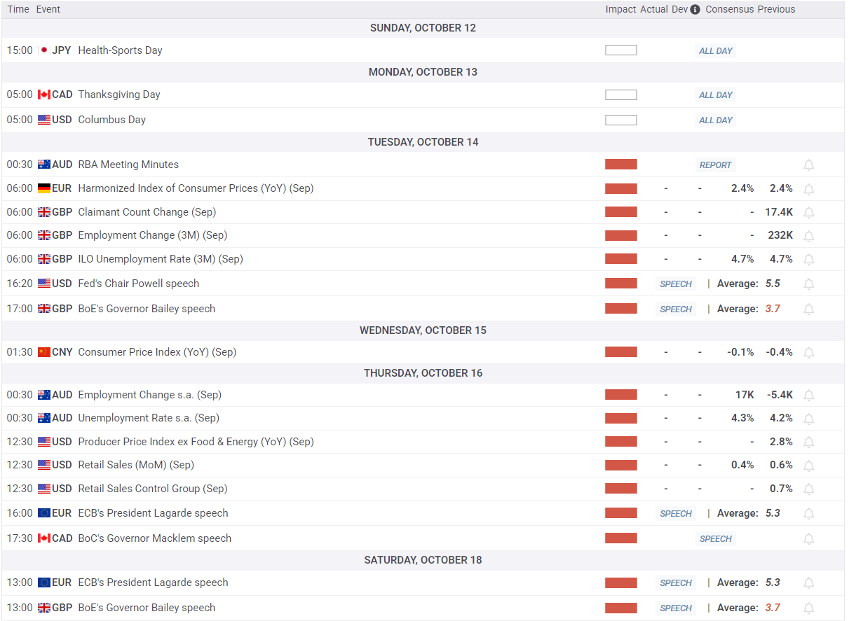 Los mercados estadounidenses estarán cerrados el lunes por el feriado del Día de Colón, pero luego los operadores de la sesión americana regresarán con nuevos temores sobre aranceles en mente, junto con un cierre del financiamiento del gobierno de EE.UU. que no muestra signos de resolución. El presidente de la Reserva Federal (Fed), Jerome Powell, hará una aparición el martes, y se espera que los datos clave del Índice de Precios de Producción (IPP) a nivel empresarial se publiquen el jueves.