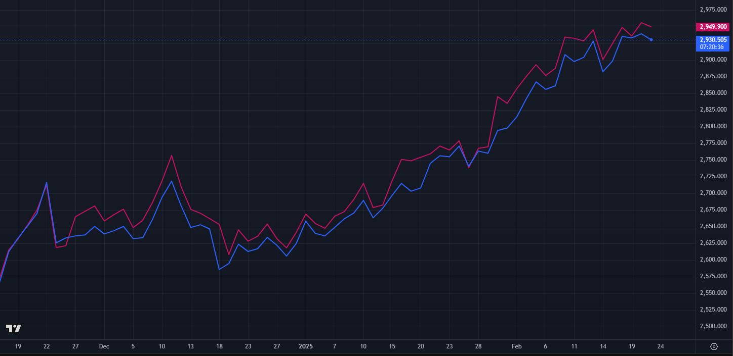 Mientras tanto, las noticias sobre algunas de las instituciones financieras más grandes del mundo capitalizando las diferencias de precios entre el mercado de futuros de Oro en Nueva York y el mercado al contado en Londres atrajeron la atención de los inversores a lo largo de la semana. Se informa que JPMorgan y HSBC son los nombres más grandes que transportan Oro de Londres a Nueva York en vuelos comerciales para cubrir pérdidas en posiciones cortas, ya que los precios de futuros en Nueva York aumentan a un ritmo más rápido que en Londres debido a las amenazas inminentes de la política arancelaria agresiva de Trump que podría desencadenar una guerra comercial con Europa. El gráfico a continuación destaca la diferencia entre los precios del Oro al contado (línea azul) y los precios de futuros de COMEX (línea roja).