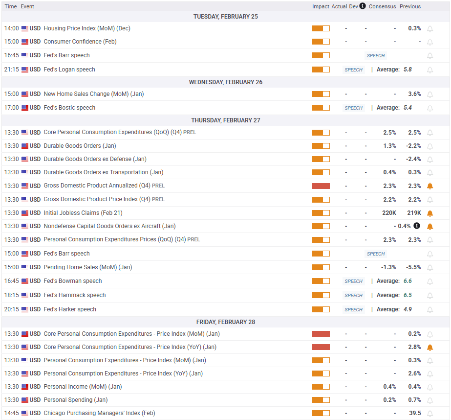 El viernes, los datos del Índice de Precios de Consumo Personal (PCE) para enero estarán destacados en el calendario económico de EE.UU. Un aumento menor al esperado en el índice de precios PCE subyacente mensual podría perjudicar al USD y apoyar el precio del Oro de cara al fin de semana.