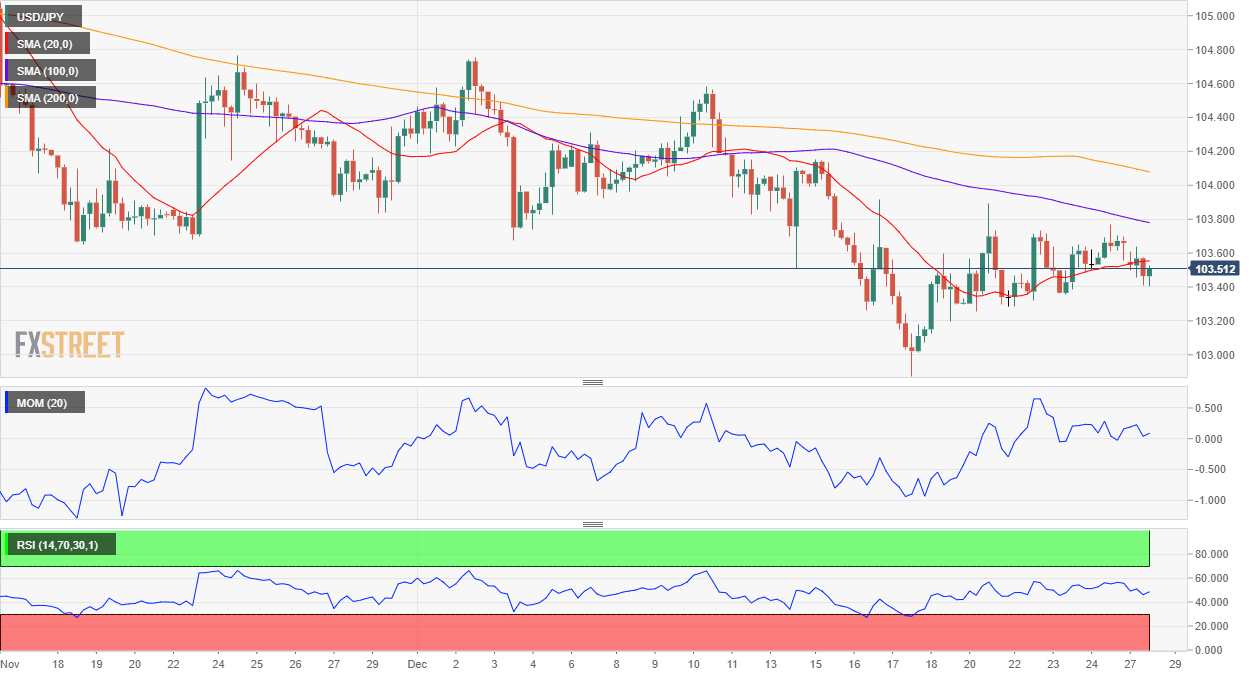 El par USD/JPY permanece neutral a corto plazo, con el riesgo sesgado a la baja. Los osos tendrán mejores posibilidades en una ruptura por debajo de 103.15, el nivel de soporte inmediato. El gráfico de 4 horas muestra que se está desarrollando por debajo de todas sus medias móviles, mientras que los indicadores técnicos oscilan alrededor de sus líneas medias. Los acercamientos al área de 104.00 probablemente atraerán interés de venta.
