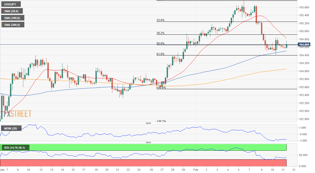 El par USD/JPY está atascado en el 50% de retroceso de su última carrera alcista, manteniendo un tono amargo. En el gráfico de 4 horas, el par se mantiene por encima de una media móvil simple de 100 ligeramente alcista, pero la media móvil simple de 20 sigue hacia el sur por encima del nivel actual. Los indicadores técnicos se han recuperado modestamente de las lecturas de cerca de sobreventa, pero carecen de impulso direccional. Se esperan más caídas en una ruptura por debajo de 104.40, el mínimo semanal y un soporte de Fibonacci, mientras que los osos tendrán menos posibilidades de una ruptura por encima de 104.95.