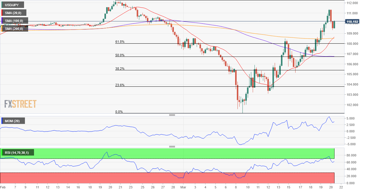 El par USD/JPY está técnicamente alcista, ya que la caída intradiaria lo ayudó a corregir las condiciones extremas de sobrecompra en el corto plazo. El gráfico de 4 horas muestra que se mantuvo por encima de todas sus medias móviles, con la SMA de 20 manteniendo su pendiente alcista por encima de las SMA de 100 y 200. Los indicadores técnicos apuntan a reanudar sus avances, manteniéndose bien en territorio positivo. Se esperan más ganancias en una ruptura por encima de 110.30, la resistencia inmediata, con el mercado presionando para una nueva prueba de 112.22, máximo mensual de febrero.