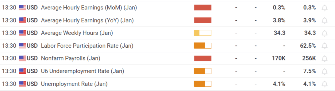 Finalmente, el informe incluirá las ganancias promedio por hora, es decir, una medida de la inflación salarial. Se espera que el aumento mensual sea del 0.3%, coincidiendo con la lectura de diciembre. Se espera que las ganancias promedio por hora hayan aumentado un 3.8% interanual (YoY), ligeramente por debajo del 3.9% registrado el mes anterior.