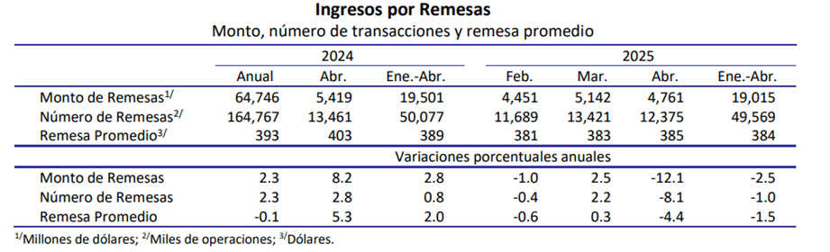 En el periodo comprendido entre enero y abril de este año, los ingresos por remesas alcanzaron los 19,015 millones de dólares, situándose por debajo de los 19,501 millones de dólares en comparación con el mismo periodo de 2024, un retroceso del 2.5% anual.