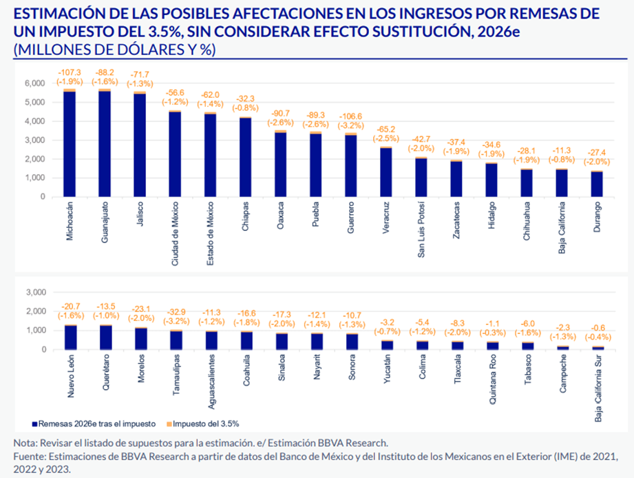 Según un análisis de BBVA Research, es altamente probable que, de aprobarse, la medida incentive el uso de canales informales y no regulados para el envío de remesas para evitar el pago de impuestos.