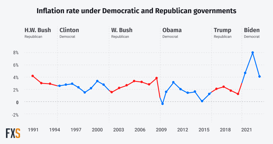 Históricamente, la economía de EE.UU. ha crecido más rápido, según las medidas del Producto Interior Bruto (PIB) real, durante las presidencias demócratas. Además, la economía tiende a producir más empleos, reducir el desempleo, generar mayores beneficios corporativos e inversión, y aumentar la producción industrial.
