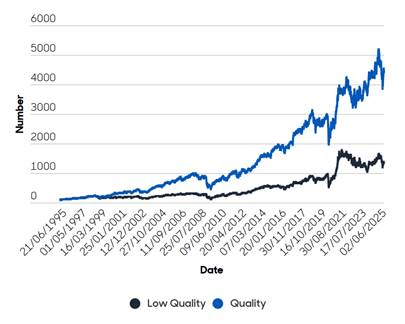 En los últimos 30 años, las empresas de calidad han superado sistemáticamente a sus homólogas de valor. El siguiente gráfico destaca las empresas de pequeña capitalización estadounidenses de alta calidad frente a las de baja calidad. Esos son unos rendimientos dignos de celebración.