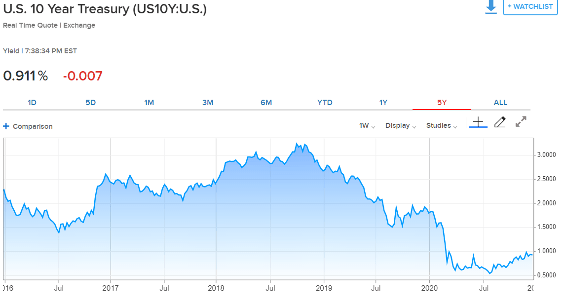El rendimiento de los bonos del Tesoro a 10 años cerró en 0.91% el martes 22 de diciembre, menos de la mitad de su promedio de los tres años anteriores. Las últimas previsiones económicas y de tipos de la Fed para 2020 prevén que los fondos federales no cambiarán hasta finales de 2023. La represión de las tasas de mercado y sus efectos económicos estimulantes podrían durar el mismo tiempo.