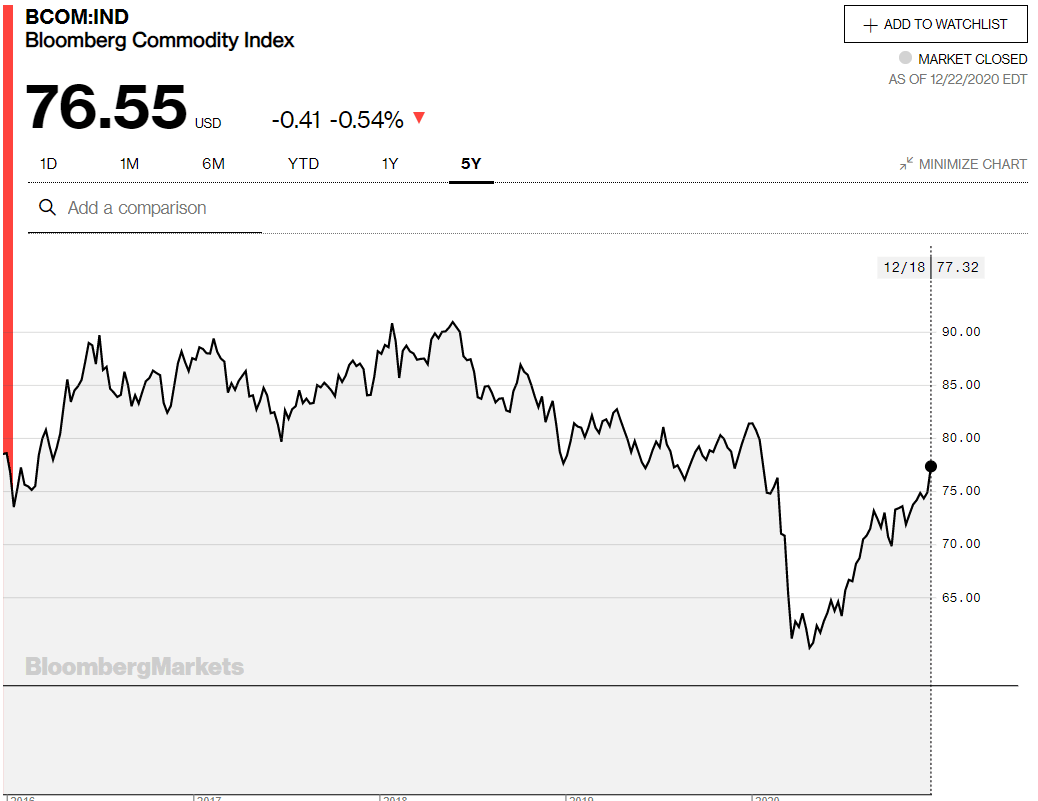 El índice de materias primas de Bloomberg (BCOM) cerró en 76.55 el martes 22 de diciembre, justo por debajo del final del viernes en 77.32, que fue su nivel más alto desde el colapso de marzo. Ha ganado un 6.2% desde el anuncio de la vacuna Pfizer una semana después de las elecciones presidenciales de Estados Unidos.