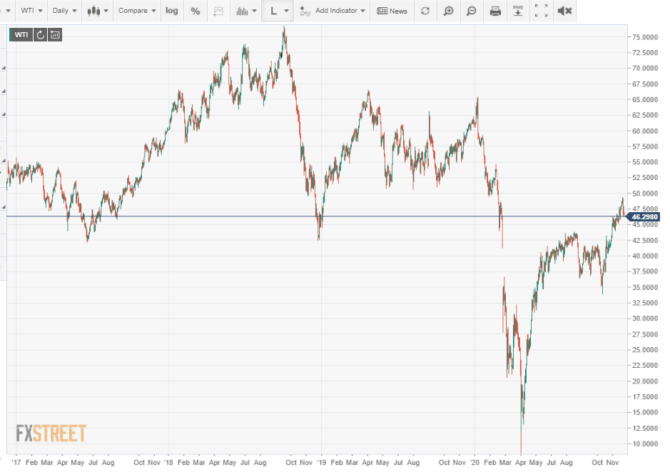 El West Texas Intermediate (WTI) ha perdido algo de brillo después de cerrar en 49.18 dólares el 18 de diciembre, su mejor resultado desde el 25 de febrero. No obstante, al cierre del martes de 46.88 dólares, el activo ha aumentado un 24.3% desde que la vacuna del COVID-19 se anunció el 9 de noviembre.