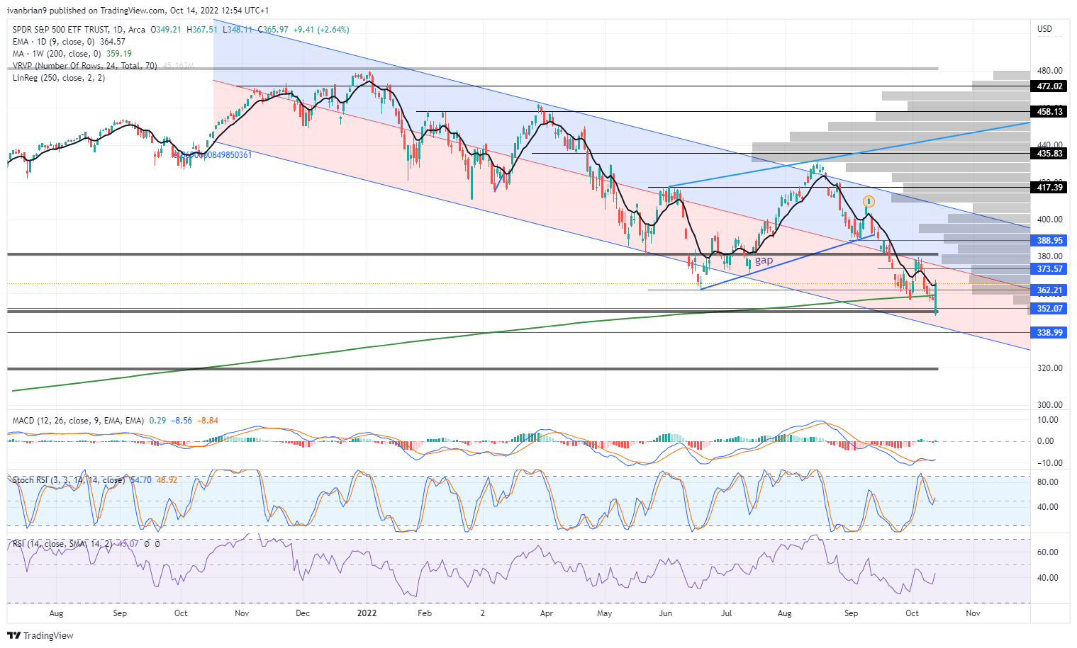 Qué hermosa vela envolvente tuvimos el jueves. Alcista, han dicho muchos, pero en mi opinión las velas envolventes son más de confusión que de reversión. Sin embargo, por ahora hemos aguantado el retroceso de Fibo y hemos evitado una capitulación a 338$. Esto todavía es posible, pero parece menos probable a corto plazo. Hoy tenemos que aguantar los 362$, y la semana que viene podemos apuntar a los 373$. Eso debería dar más recorrido a la recuperación y llevarnos al objetivo de 388$.
