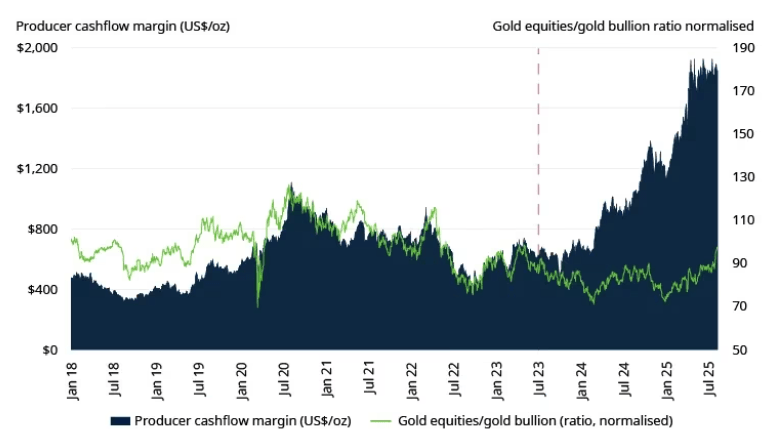 Normalmente, las acciones de oro lo hacen mejor que el oro físico cuando los márgenes de sus flujos de caja se expanden, y lo hacen peor cuando se contraen. Desde finales de 2023, los márgenes se han expandido a niveles sin precedentes a medida que crecía el interés por el oro. Esta expansión de márgenes se explica porque el precio del oro viene marcado por su papel como activo monetario o como “dinero que no es deuda”. Al mismo tiempo, la inflación de los productores de oro (entre otros debido al bajo coste de la energía) se ha reducido. Los márgenes actuales son un 100% más altos que en último pico en el verano del Covid.