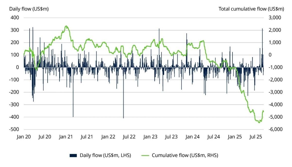 No creemos que los inversores occidentales estén comprando oro ciegamente. De hecho, hasta hace poco han estado “vendiendo el rally”. El tirón que hemos visto desde el 2022 hasta la segunda mitad de este año lo han motivado sobre todo los bancos centrales emergentes y algo los hogares e inversores institucionales emergentes. Muchos inversores occidentales siguen traumatizados por la década de pobre comportamiento del oro entre el 2005 y el 2015 y solo ahora lo han vuelto a considerar. En este contexto fiscal y geopolítico, esperamos una participación mucho más agresiva del inversor occidental.
