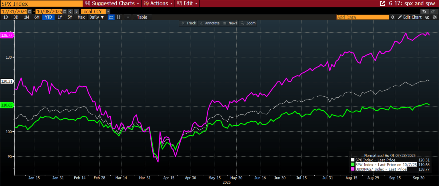 Gráfico 1: S&P 500 ponderado por igual, S&P 500 ponderado por capitalización de mercado y los Magníficos 7. Los Mag 7 han liderado la recuperación del mercado desde abril, mientras que el S&P 500 ponderado por igual ha quedado rezagado.
