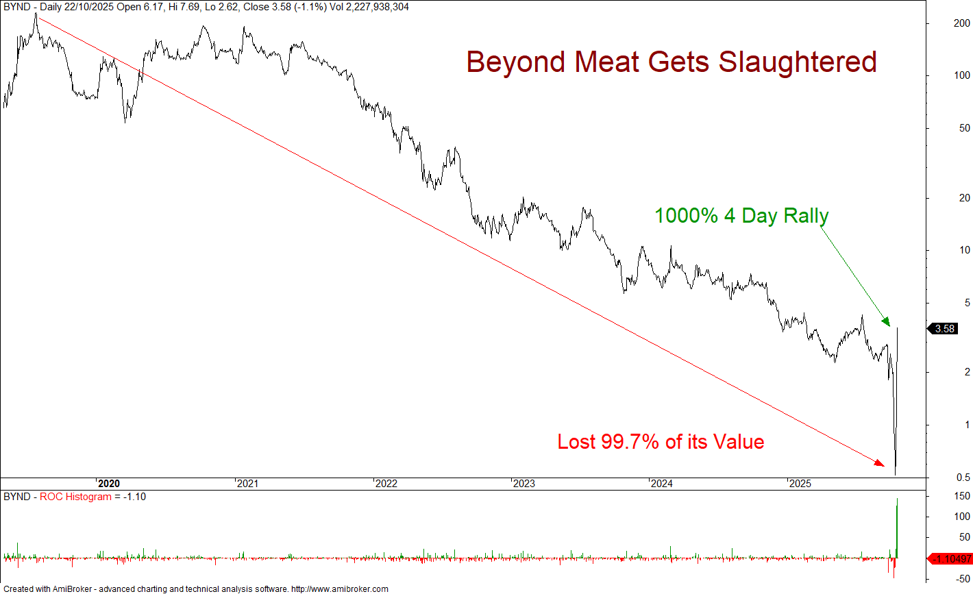La semana pasada le dije a mi hermana que disfrutara de sus hamburguesas Beyond Meat, ya que creo que están a punto de quebrar. La acción bajó un 99,7% desde su máximo histórico. Luego recibió impulso en Reddit, luego el ETF de acciones meme de Roundhill Investments la incluyó en su cesta, y así se produjo una subida del 1000% en los 4 días siguientes.