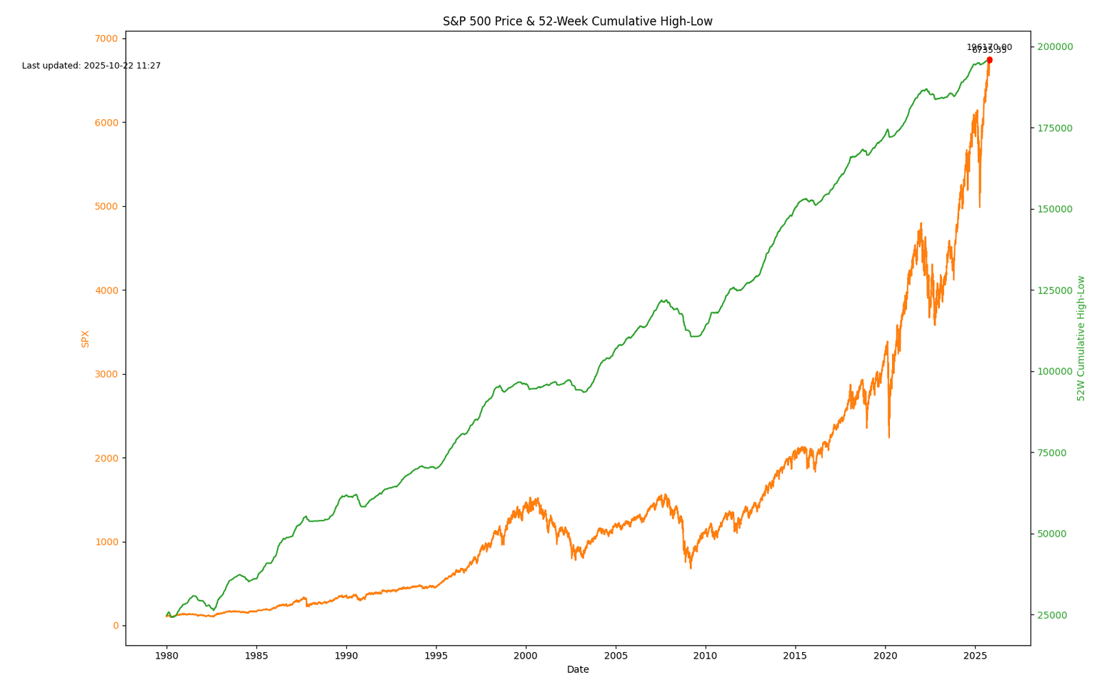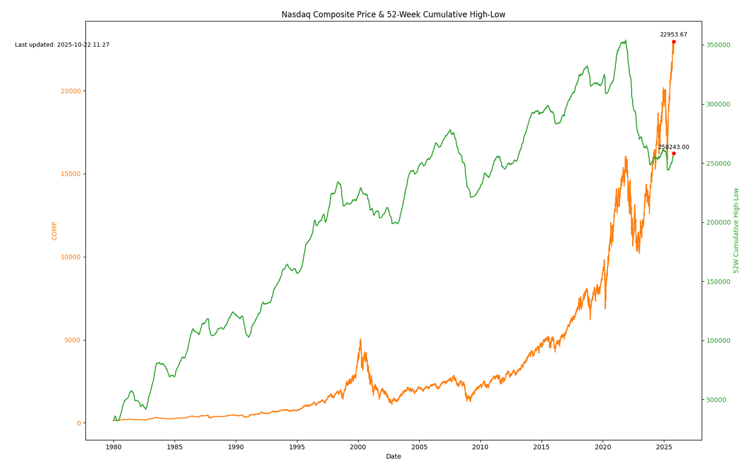 Noté una divergencia interesante entre el S&P 500 y su índice acumulativo de máximos y mínimos de 52 semanas y su contraparte del Nasdaq. Como puedes ver, el S&P 500 está destacando.
