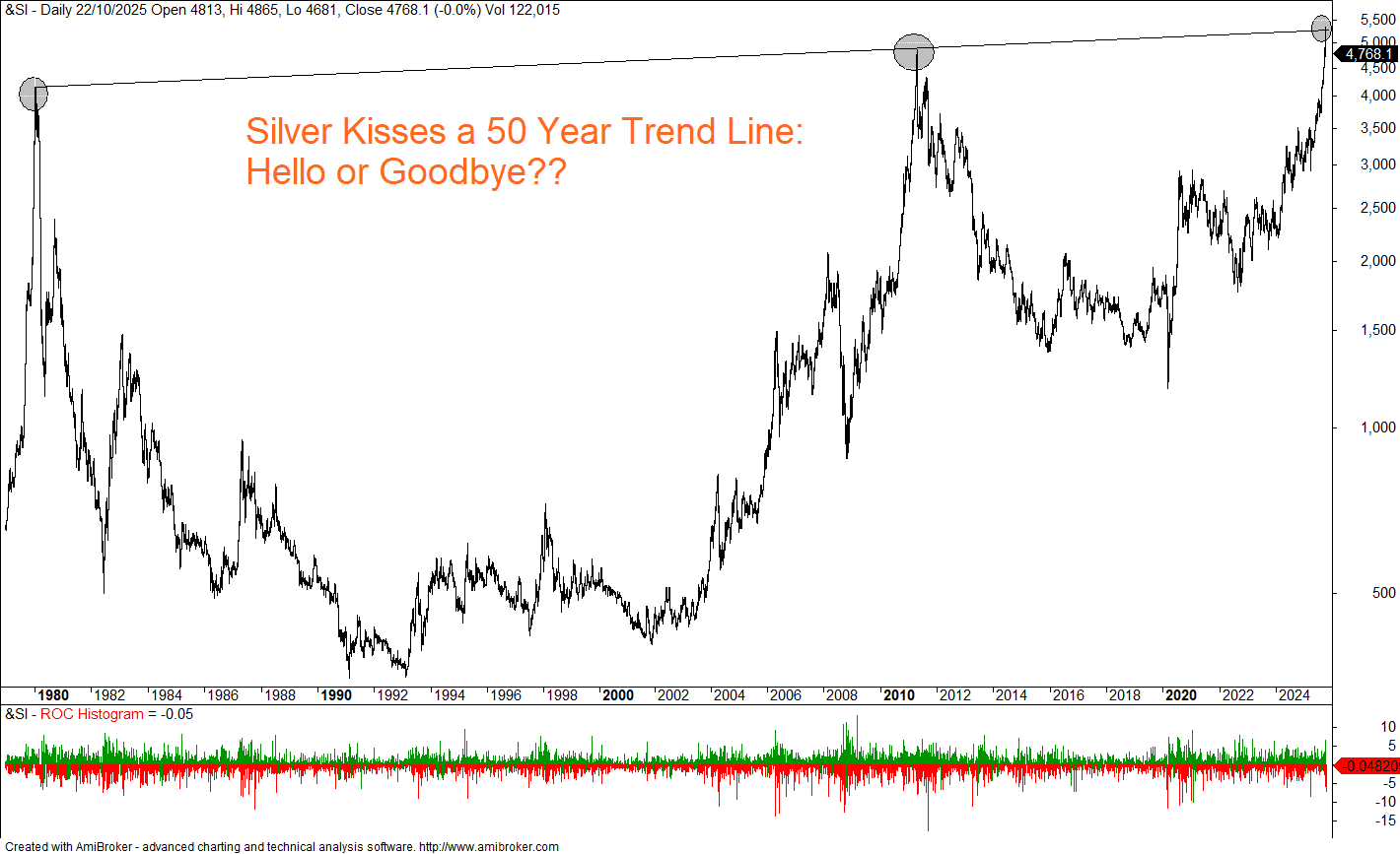 Ha habido mucha acción en el sector de metales preciosos últimamente. No tengo un gráfico de Plata al contado lo suficientemente largo, pero tengo un contrato continuo de futuros de Plata bastante largo. Vaya, la Plata tiene una tendencia a despegar. Estamos justo en una línea de tendencia de resistencia importante. La Plata debería seguir el liderazgo del Oro a largo plazo, pero podría ser un viaje salvaje. HighLo Silver.