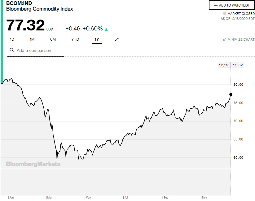 El índice de materias primas de Bloomberg (BCOM) cerró en 77.32 el viernes 18 de diciembre, su nivel más alto desde el colapso de marzo. Ha ganado un 6.2% desde el anuncio de la vacuna de Pfizer una semana después de las elecciones presidenciales de Estados Unidos.