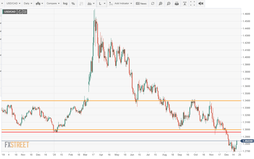 Una advertencia sobre los datos, el regreso de los despidos en los Estados Unidos en noviembre y diciembre, junto con las débiles nóminas de noviembre y la incapacidad del Congreso de los Estados Unidos para aprobar un segundo proyecto de ley de estímulo hasta ese momento, fueron los factores decisivos en la caída del USD/CAD por debajo del soporte de dos años en 1.2960 a principios de diciembre.