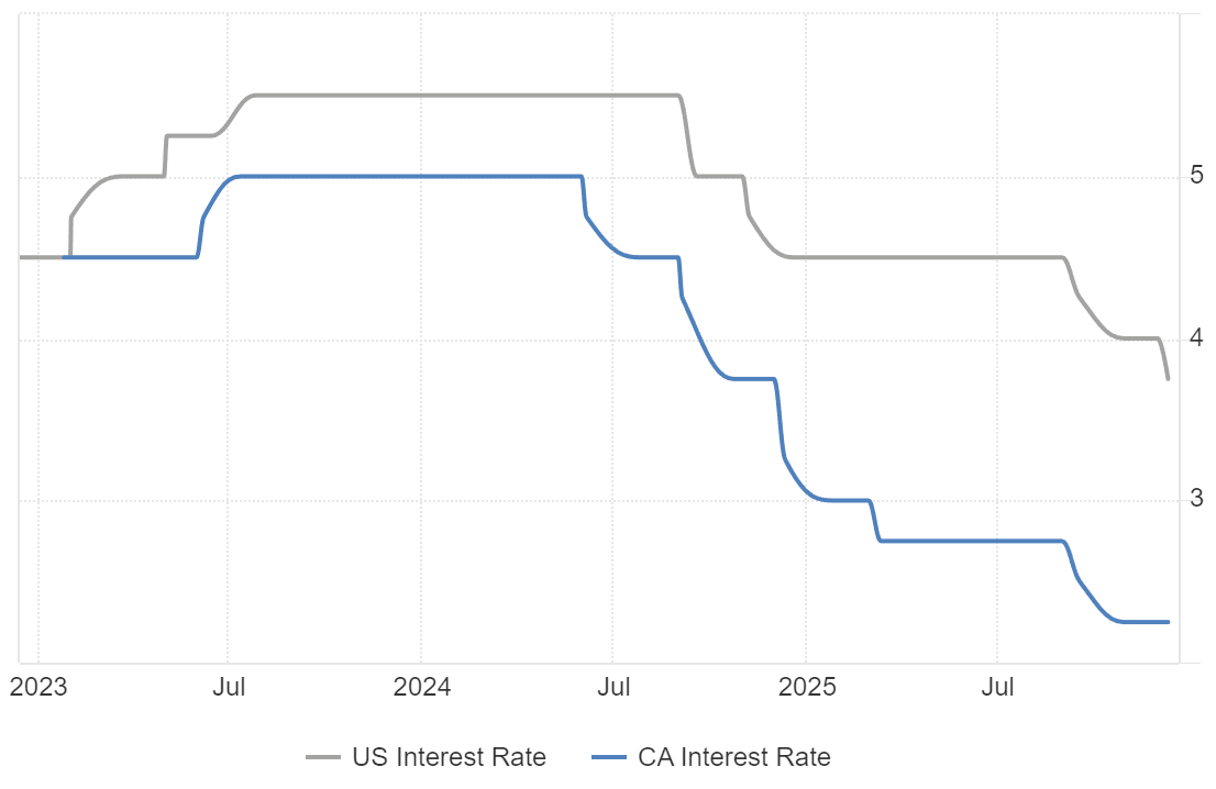 El Banco de Canadá (BoC), que se adelantó a la Reserva Federal en el recorte de tipos, se ha quedado con poco margen para seguir avanzando en materia de tipos de interés. Si bien el rápido ritmo de recorte de tipos ha dejado al BoC con una capacidad limitada para contrarrestar las presiones recesivas, la deprimida tasa de interés canadiense implica que los flujos de divisas canadienses sobre los diferenciales de tipos solo tienen una dirección posible, ya que parece más probable que la Reserva Federal acelere el ritmo de recortes de tipos.