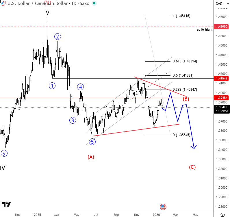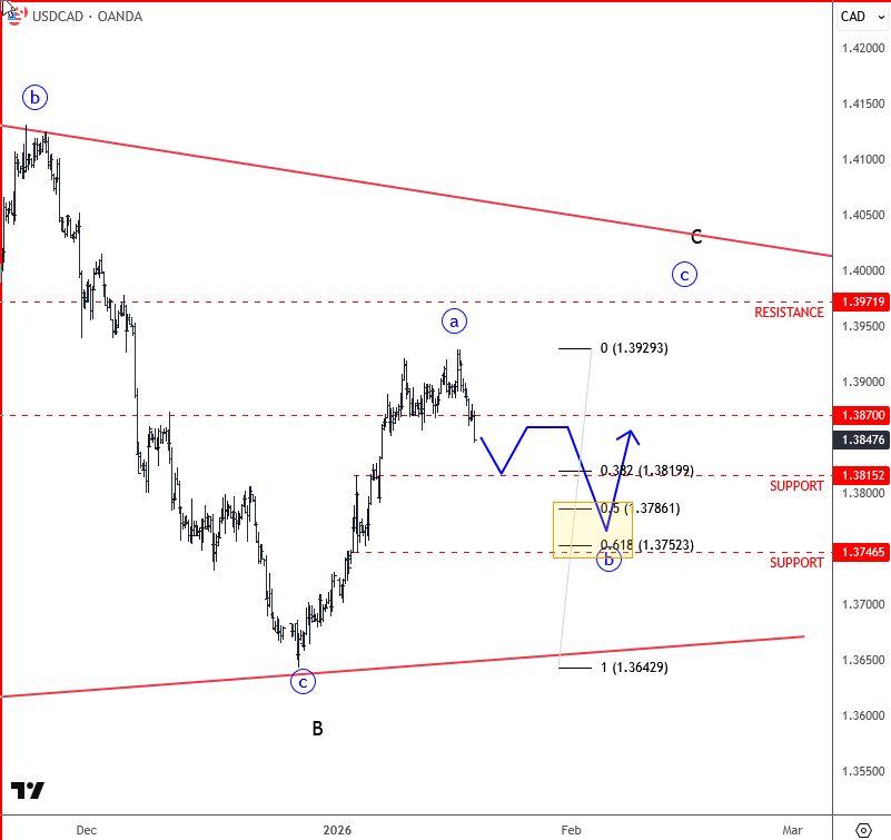 El USD/CAD está revirtiendo de manera bastante pronunciada al alza al inicio de enero, pero no olvidemos que esto aún puede ser flujos de inicio de año, que a menudo se revierten. A pesar de este rebote, el movimiento aún parece correctivo, pero idealmente ahora está formando un patrón triangular bajista ABCDE lateral en la onda (B) antes de una continuación a la baja dentro de la onda (C) en un gráfico diario. En el gráfico de 4 horas, estamos siguiendo la onda C que puede estar compuesta por tres piernas abc, y puede volver a la parte superior de un rango triangular cerca del nivel de resistencia de 1.4000 antes de que veamos una nueva desaceleración dentro de la onda D. Después de la reciente pierna aguda e impulsiva hacia arriba en la subonda "a", ahora puede estar haciendo un retroceso correctivo en la subonda "b", que puede volver a probar la zona de soporte de 1.3815 - 1.3745 antes de que ocurra una recuperación mayor dentro de la subonda "c" de C.