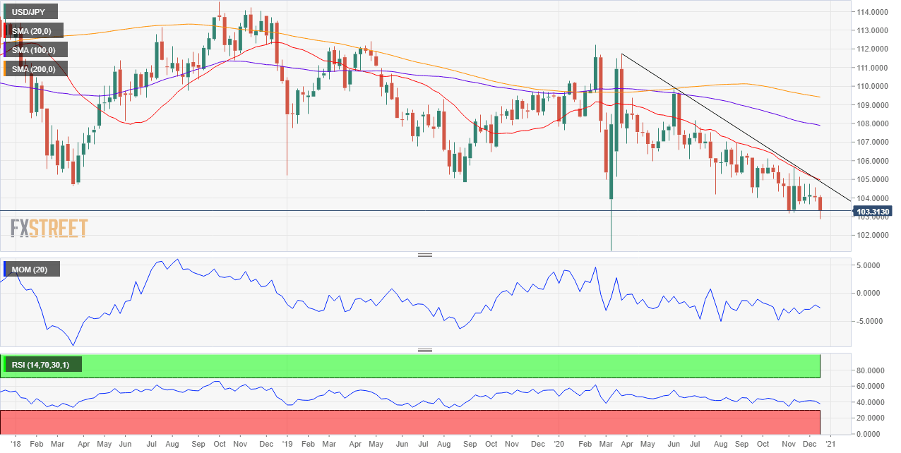 Echando un vistazo al gráfico mensual y descartando los cambios bruscos de marzo que enviaron al par a 101.17, el par se mueve en niveles vistos anteriormente a finales de 2016. Se estableció un mínimo crítico en 98.95. La tendencia bajista parece firme ya que el USD/JPY finaliza en diciembre por debajo de la media móvil simple de 200 meses, que ofreció soporte en el período mencionado de 4 años. La SMA de 20 meses cruza por debajo de la SMA 100, mientras que los indicadores técnicos mantienen sus pendientes bajistas dentro de niveles negativos.