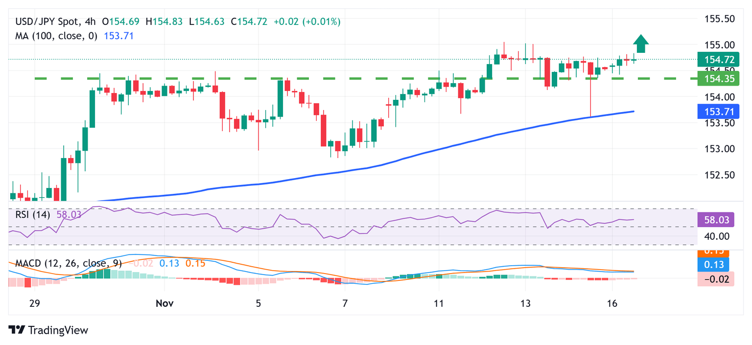 El par USD/JPY encontró un soporte decente cerca de la media móvil simple (SMA) de 100 periodos en el gráfico de 4 horas el viernes, y el posterior movimiento por encima del obstáculo horizontal de 154.45-154.50 favorece a los operadores alcistas. Dado que los osciladores en los gráficos de 4 horas/día se mantienen en territorio positivo y aún están lejos de estar en la zona de sobrecompra; algo de fuerza adicional más allá de la marca psicológica de 155.00 reafirmará la perspectiva constructiva. Los precios al contado podrían entonces acelerar el impulso positivo hacia el obstáculo intermedio de 155.60-155.65 antes de apuntar a recuperar la cifra redonda de 156.00.