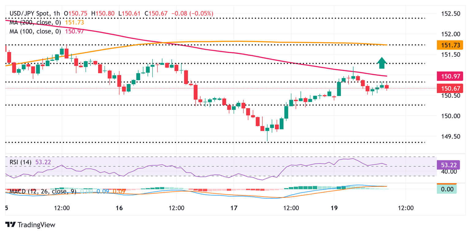 Por otro lado, el impulso de regreso por encima del nivel de retroceso del 38.2% de Fibonacci, acercándose a la marca de 151.00, podría enfrentar cierta resistencia cerca de la región de 151.30-151.35, o el nivel de retroceso del 50%. Algunas compras de continuación podrían elevar el par USD/JPY hacia la confluencia de 151.75, que comprende el nivel de retroceso del 61.8% de Fibonacci y la SMA de 200 horas. Una fuerza sostenida más allá de este último debería permitir que los precios al contado superen la marca de 152.00 y suban hacia el siguiente obstáculo relevante cerca de la zona de resistencia de 152.25 en ruta hacia la marca de 153.00.