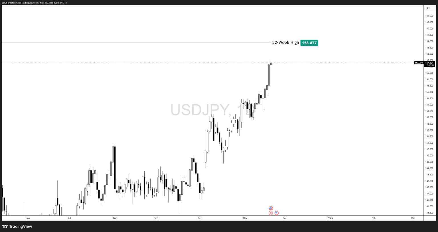 El USDJPY continúa dominando el mercado de divisas con una poderosa tendencia alcista. El yen sigue bajo una fuerte presión ya que Japón se encuentra en el extremo extremo de la política monetaria global, manteniendo tasas cercanas a cero mientras el resto del mundo se mantiene significativamente más ajustado. Esto por sí solo ha mantenido al USDJPY elevado durante la mayor parte del año.