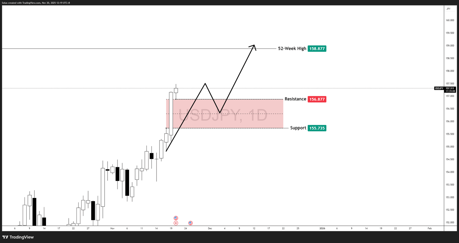 El reciente impulso hacia la parte alta de los 157 muestra el mismo patrón que hemos visto durante semanas: fuertes piernas impulsivas con correcciones superficiales. Si bien esto habla de una demanda persistente por el USDJPY, también plantea la pregunta: ¿es un retroceso más profundo necesario antes de un intento de ruptura en el máximo de 52 semanas?
