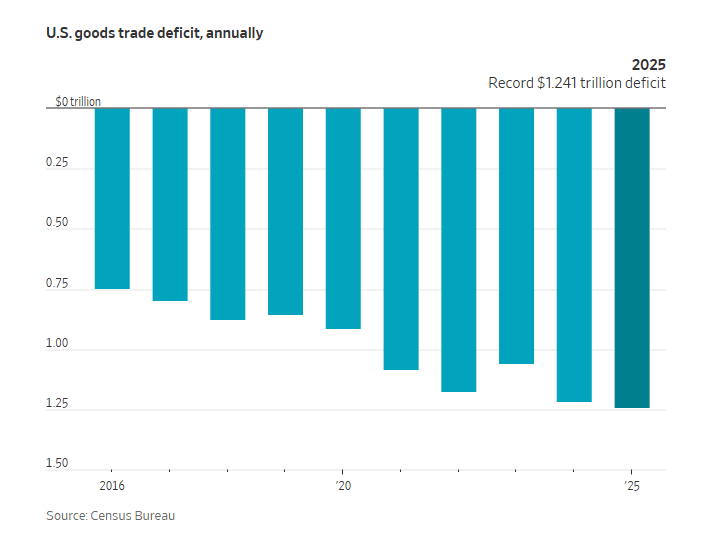 Finalmente, vale la pena agregar que el déficit comercial de EE.UU. ha estado creciendo exponencialmente desde 2012, alcanzando una tasa anual ajustada estacionalmente de 1.37 billones de dólares en el primer trimestre de 2025, según la Oficina de Análisis Económico de EE.UU., justo antes de que los aranceles de Trump entraran en vigor. El déficit mejoró después, pero sufrió un gran revés a principios de 2026, con Trump culpándolo del cierre de octubre.